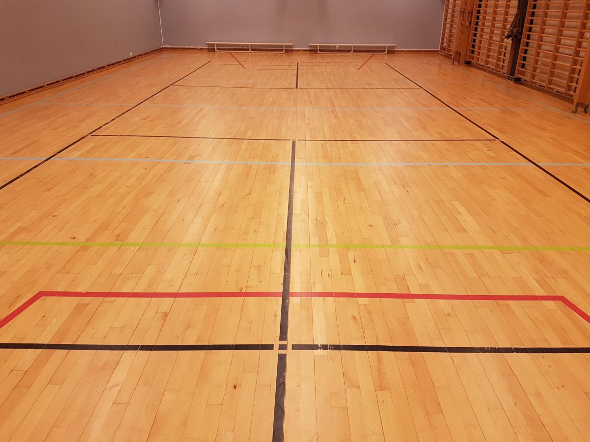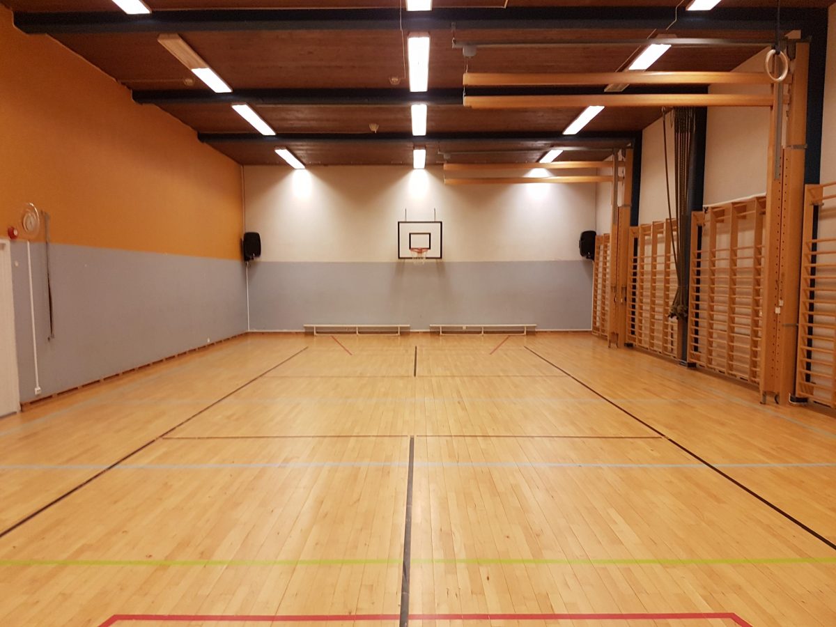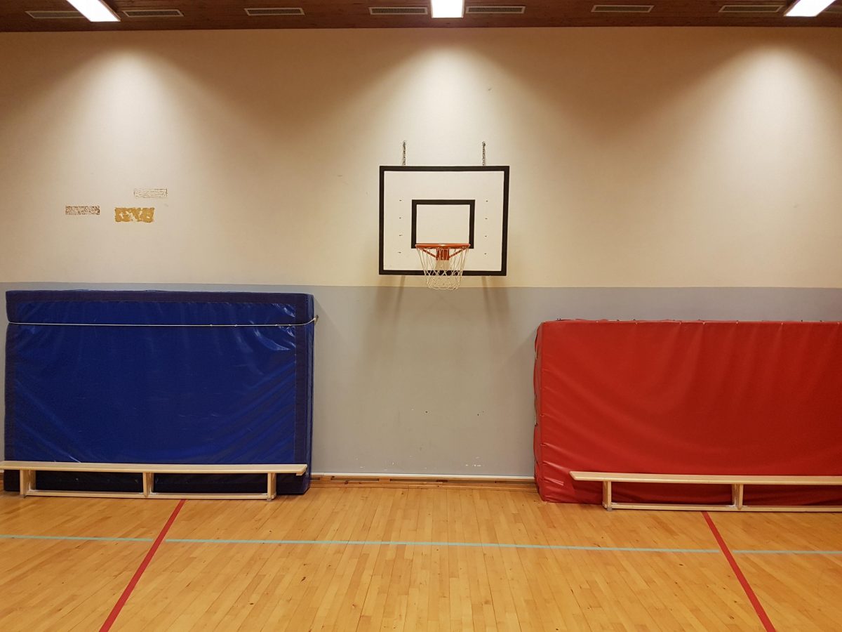 Basketballkurver, garderober, dusjer, ribbevegger og balansebom.