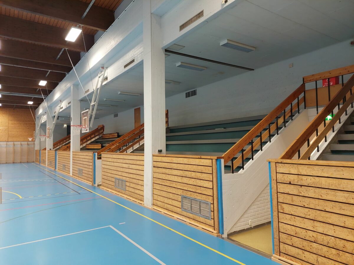 Garderober (4 stk.), basketballkurver, håndballmål, innebandymål, badmintonstativer (+nett), volleyballstativer (+ nett)