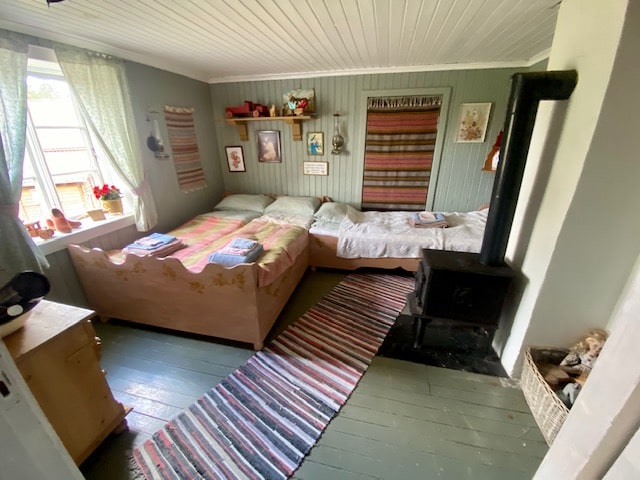Her er det vedfyring i fire av rommene. Stua inneholder 1 soverom med to dobbeltsenger, 1 soverom med to enkeltsenger, 1 soverom med en dobbeltseng, kammers med en enkeltseng (dette rommet har ingen fyring om vinteren) det er også en skueseng i stua. Hvert soverom er utstyrt med puter, dyner og vaskevannsfat. Stua har langbord som kan slås ut til 10 stk. På kjøkken er det utstyrt med hybelkonfyr og to kokeplater + svartovn hvor det er muligheter for matlaging. Kjøleskap med en liten fryseboks, vannkoker og ellers det man trenger for matlaging. Kok opp vann og ta oppvasken i balje.