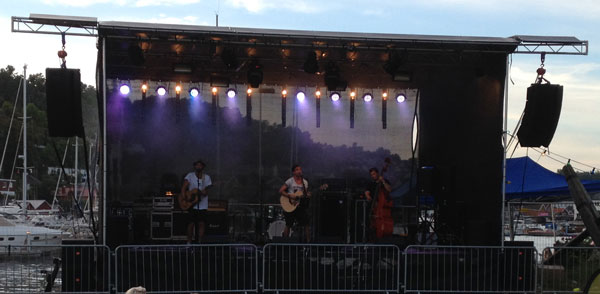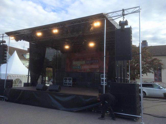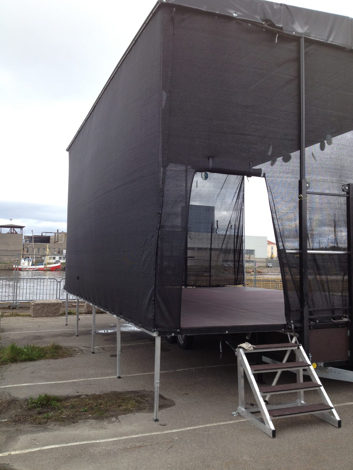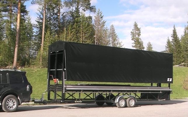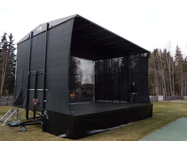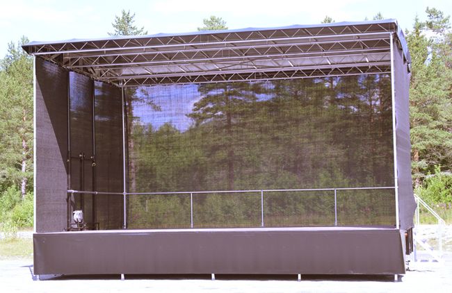 Alle cover som sidevegger og bakvegg i sort vindnett som standard. Tak og cover under fronten av scenekanten i sort pvc duk.