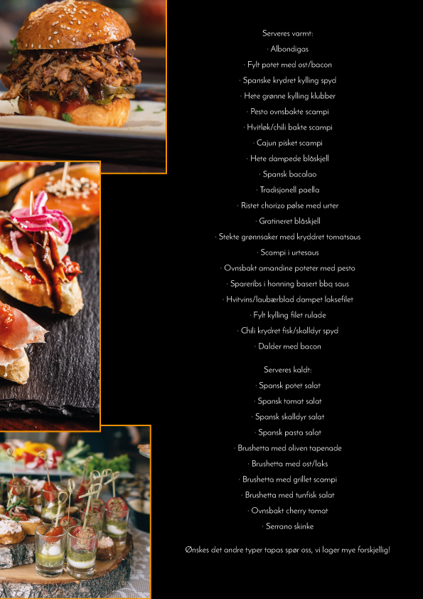 Vi legger veldig STOR vekt på ferske og unike råvarer da all vår mat er laget fra bunnen av og med stor kjærlighet. Vi tilpasser også våre menyer etter ønske om det skulle være allergier eller en annen årsak.