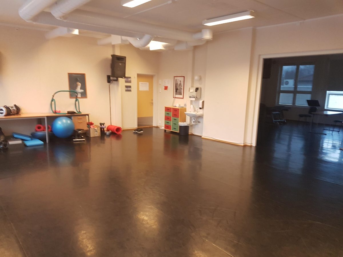 Liten dansesal med dansemater. kan brukes til dansetimer, sangtimer, gruppetimer for styrke, yoga.