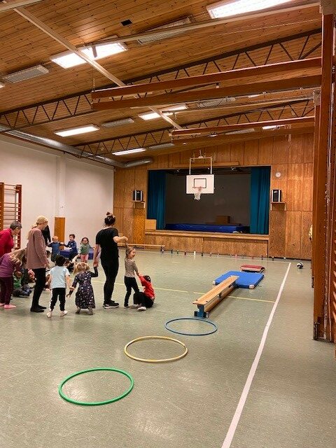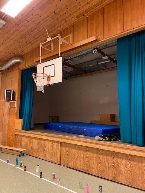2 basketkurver, volleyballnett, ribbevegger, benker, tjukkas, bommer, 2 innebandymål.